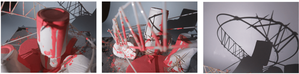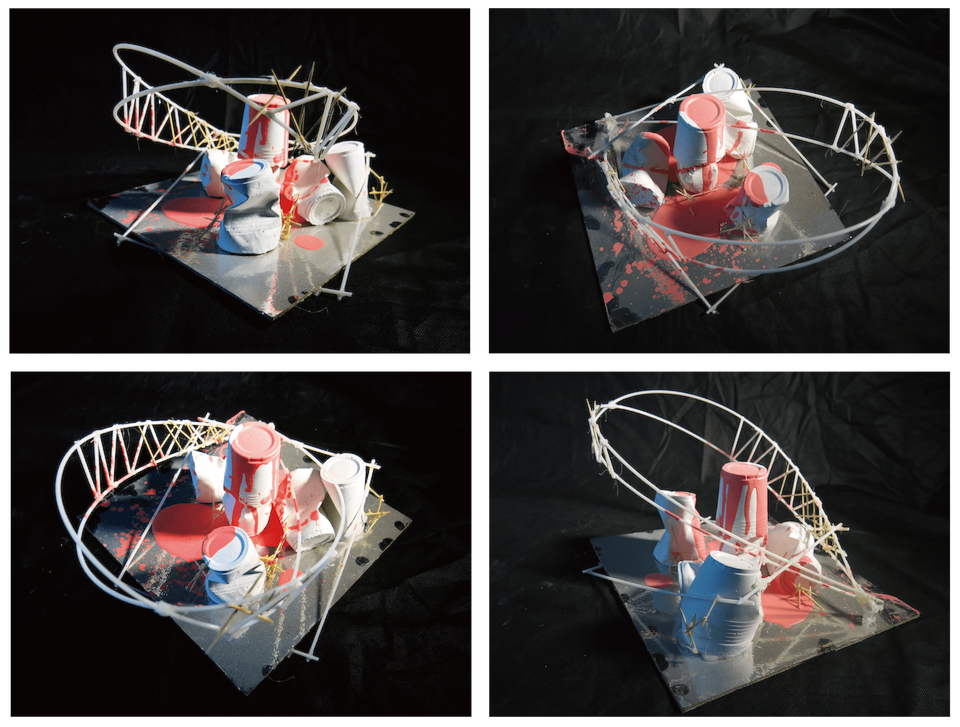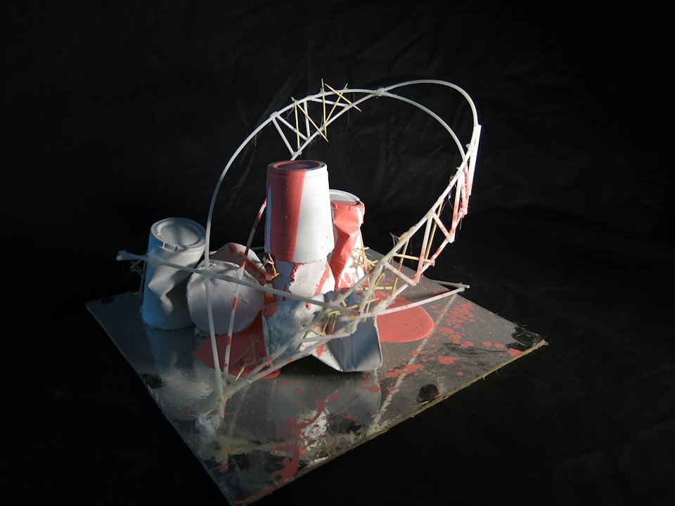 To create an illusion of “broken piece of water”, I combined plaster in the shape of the inside of a cup – imitating the solidified movement of water- with splashes of bright pink acrylic paint. This creates a visual impulse with a stark contrast in texture and colors. The arch floats on top the cups, as if it grows out of them, representing the concept of grafting.v