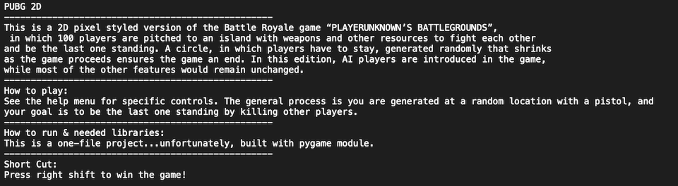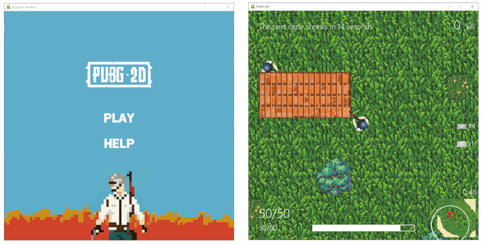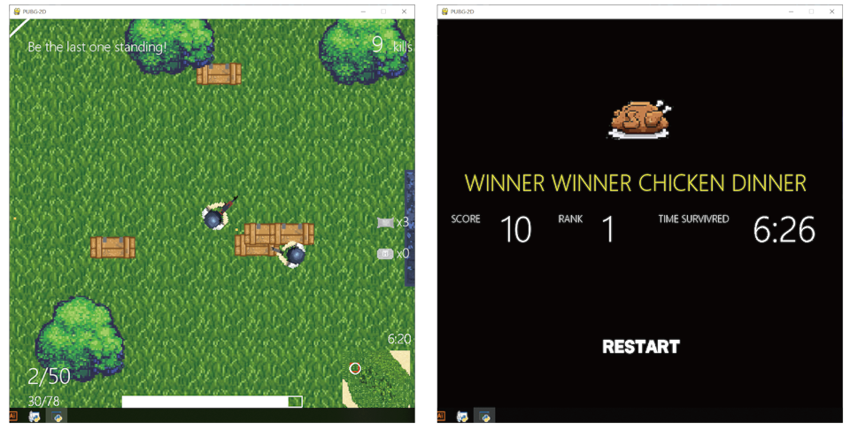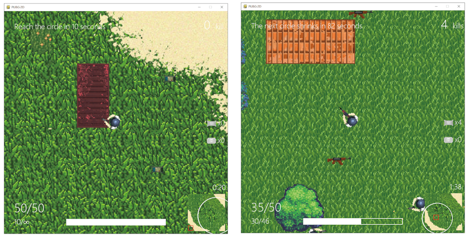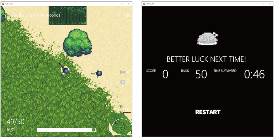 This is a 2D pixel styled version of the Battle Royale game “PLAYERUNKNOWN’S BATTLEGROUNDS”, in which 100 players are pitched to an island with weapons and other resources to fight each other and be the last one standing. A circle, in which players have to stay, generated randomly that shrinks as the game proceeds ensures the game an end. In this edition, AI players are introduced in the game, while most of the other features would remain unchanged.